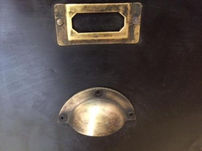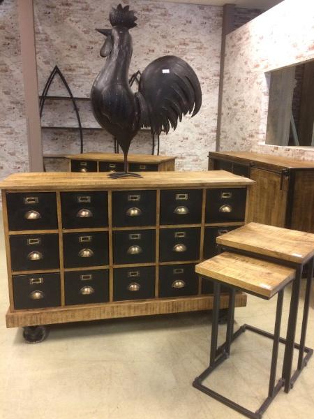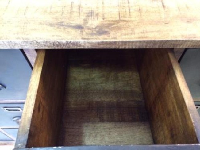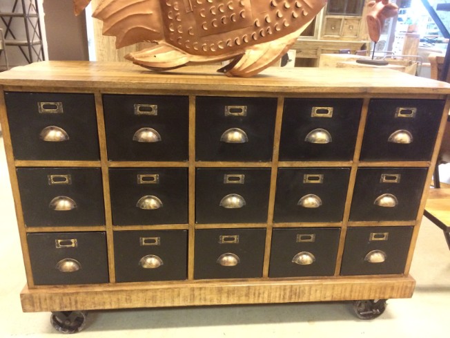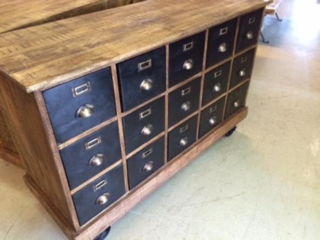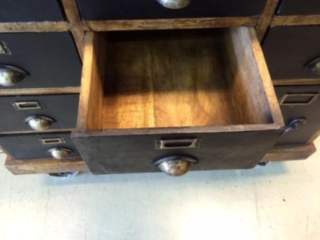 Dressoir van mango hout met 15 laden, de laden zijn bekleed met zwart metaal.
