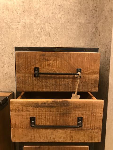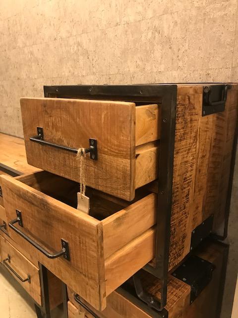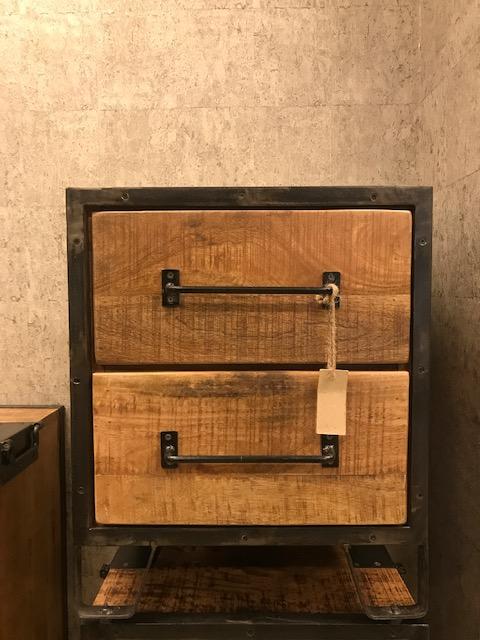 Industrieël nachtkastjevan metaal gecombineerd met blank mangohout. Dit dressoir is van zwart gespoten metaal, de lades zijn van mangohout. Het mangohout is naturel van hout en een ware eyecatcher.