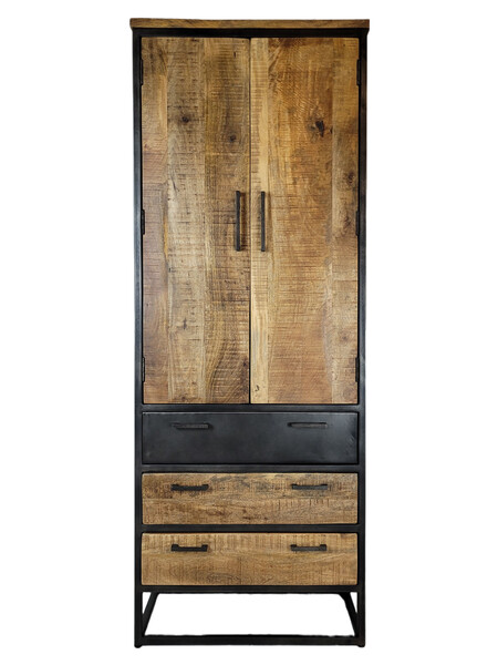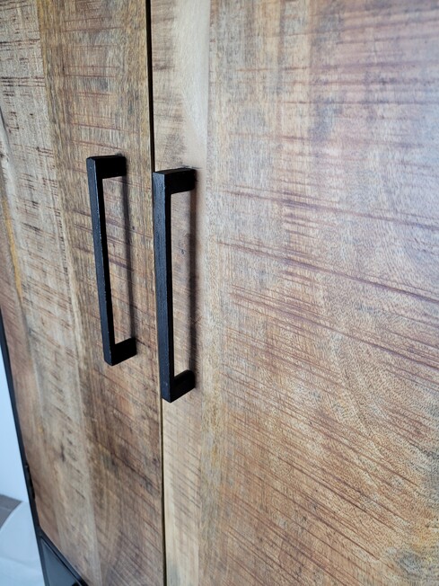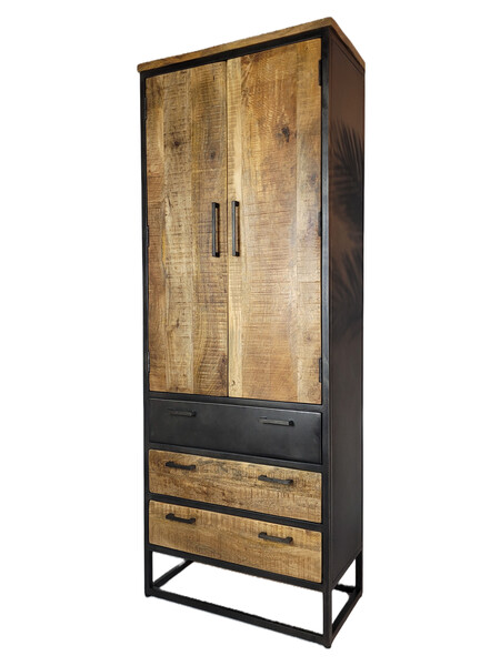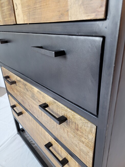 Industriële kast van metaal gecombineerd met blank mangohout. Deze kast is van zwart gespoten metaal, de lades en deuren zijn van mangohout. Het mangohout is naturel van hout en een ware eyecatcher.