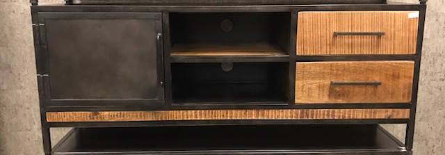 Industriële Tv Kast van metaal gecombineerd met blank mangohout. Deze tv kast is van zwart gespoten metaal, de lades zijn van mangohout. Het mangohout is naturel van hout en een ware eyecatcher.