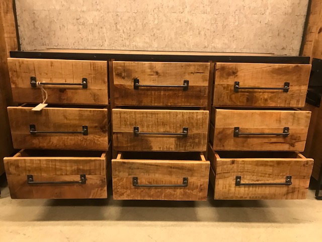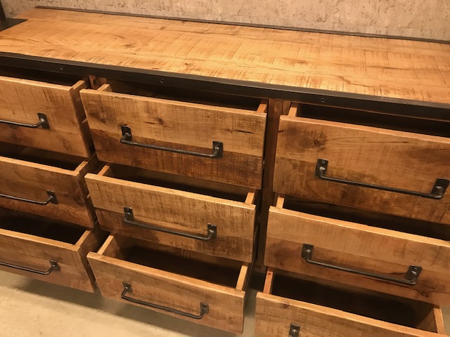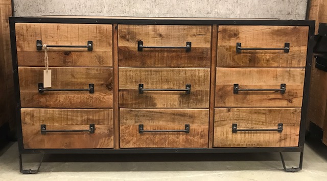 Industrieél dressoir van metaal gecombineerd met blank mangohout. Dit dressoir is van zwart gespoten metaal, de lades zijn van mangohout. Het mangohout is naturel van hout en een ware eyecatcher.