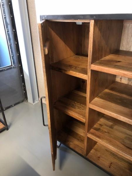Industriële kast van metaal gecombineerd met blank mangohout. Dit dressoir is van zwart gespoten metaal, de deuren zijn van mangohout. Het mangohout is naturel van hout en een ware eyecatcher.