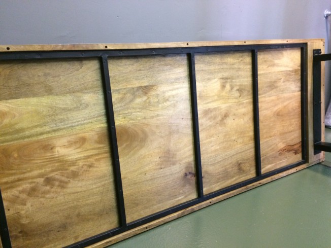 De eettafel is voorzien van een mango blad, gecombineerd met zwart metalen U