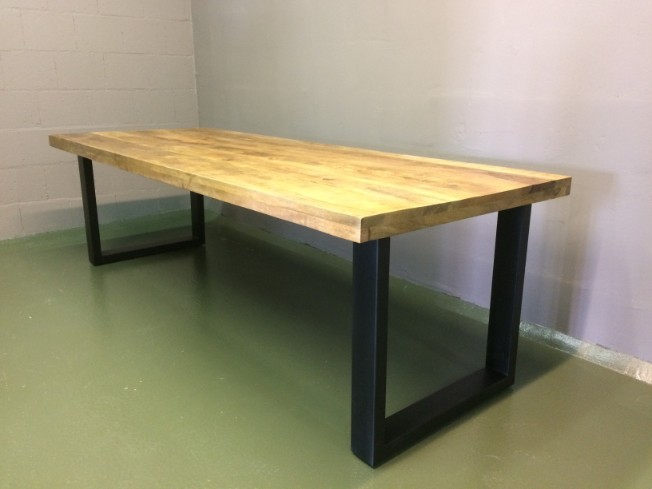 De eettafel is voorzien van een mango blad, gecombineerd met zwart metalen U