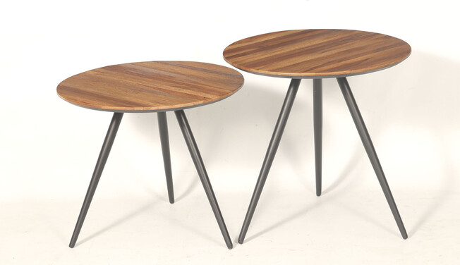 Een bijzettafel set van 2, teakhout blad met een prachtige finish. Mooi als set of handig als twee losse bijzettafels. Afmeting: L: Ø50 x H47 cm S: Ø50x H42,5 cm