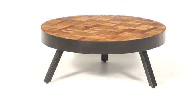 Deze prachtige salontafel van zwart metaal en ingelegd met teakhout voor een unieke uitstraling.