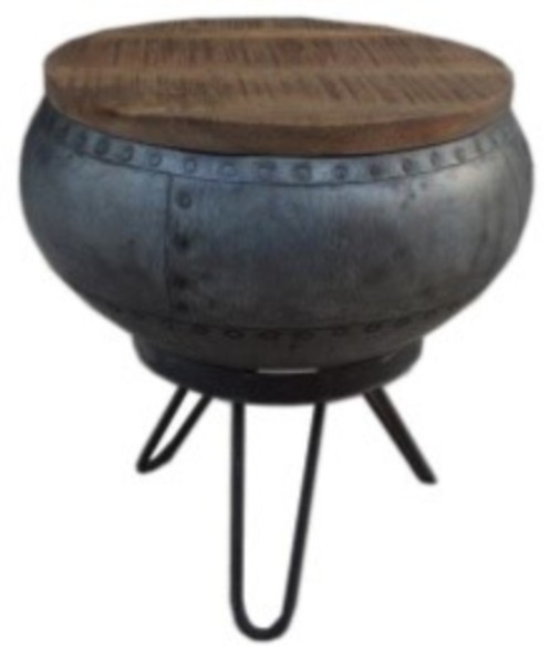 Bijzettafel gemaakt van een metalen schaal op pootjes met een mango houten blad erop.