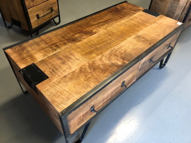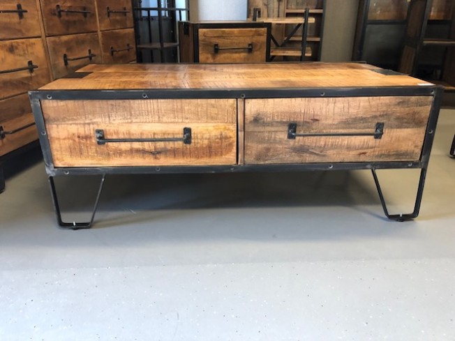 Industriële salontafel in combinatie van blank mangohout. Deze salontafel is van zwart gespoten metaal, de lades zijn van mangohout. Het mangohout is naturel van hout en een ware eyecatcher.
