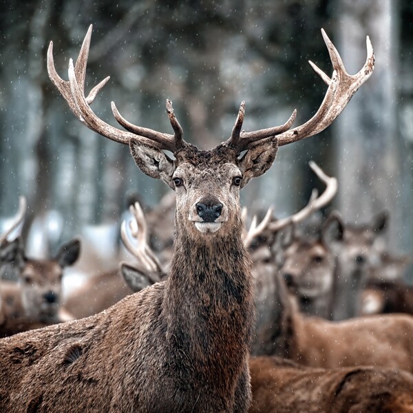 Een prachtig glasschilderij van een portret van een hert met een groot gewei.