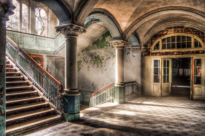 Kies dan voor dit prachtige Glasschilderij Vervallen Trappenhuis, want het is perfect voor in de woonkamer of in de slaapkamer. Op de schilderij zie je licht binnenvallen in een vervallen Gebouw.