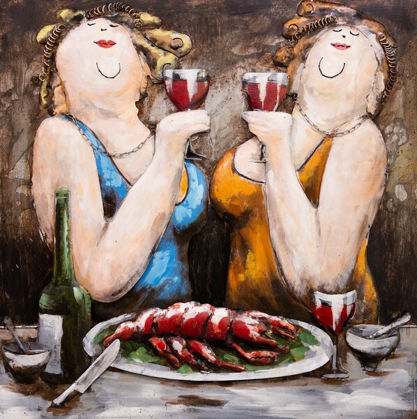 Het 3D Metaal Schilderij - Dikke Dames Vierkant toont twee dames die een heerlijk glaasje wijn aan het drinken zijn.