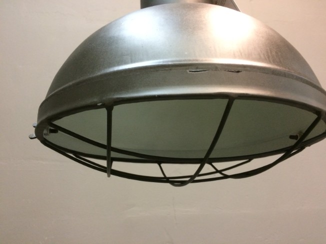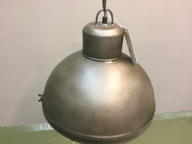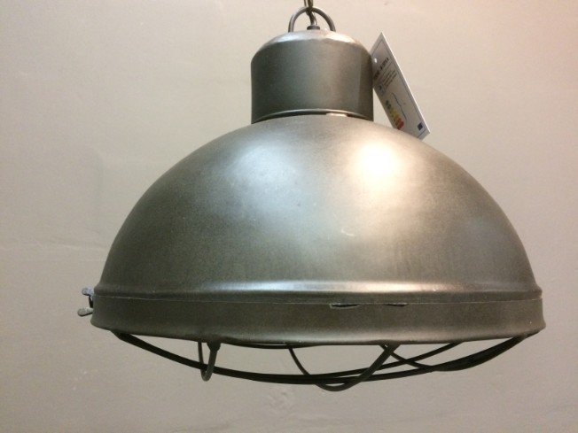 Industriële hanglamp in een donker grijze kleur met een zwart rooster onder de lamp.