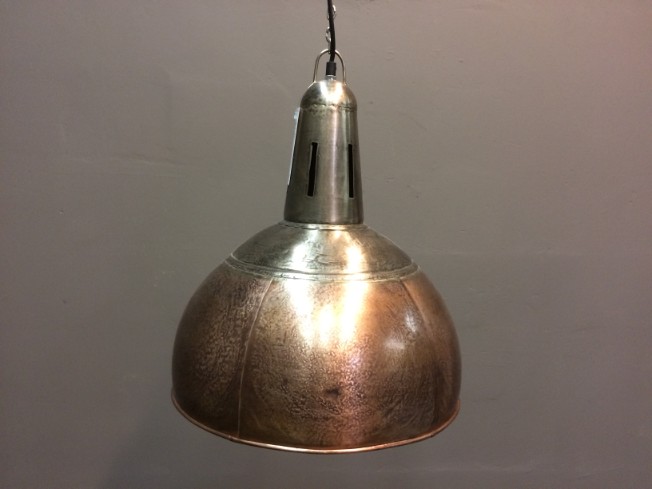 Koper kleurige hanglamp met een zilver kleurige bovenkant.